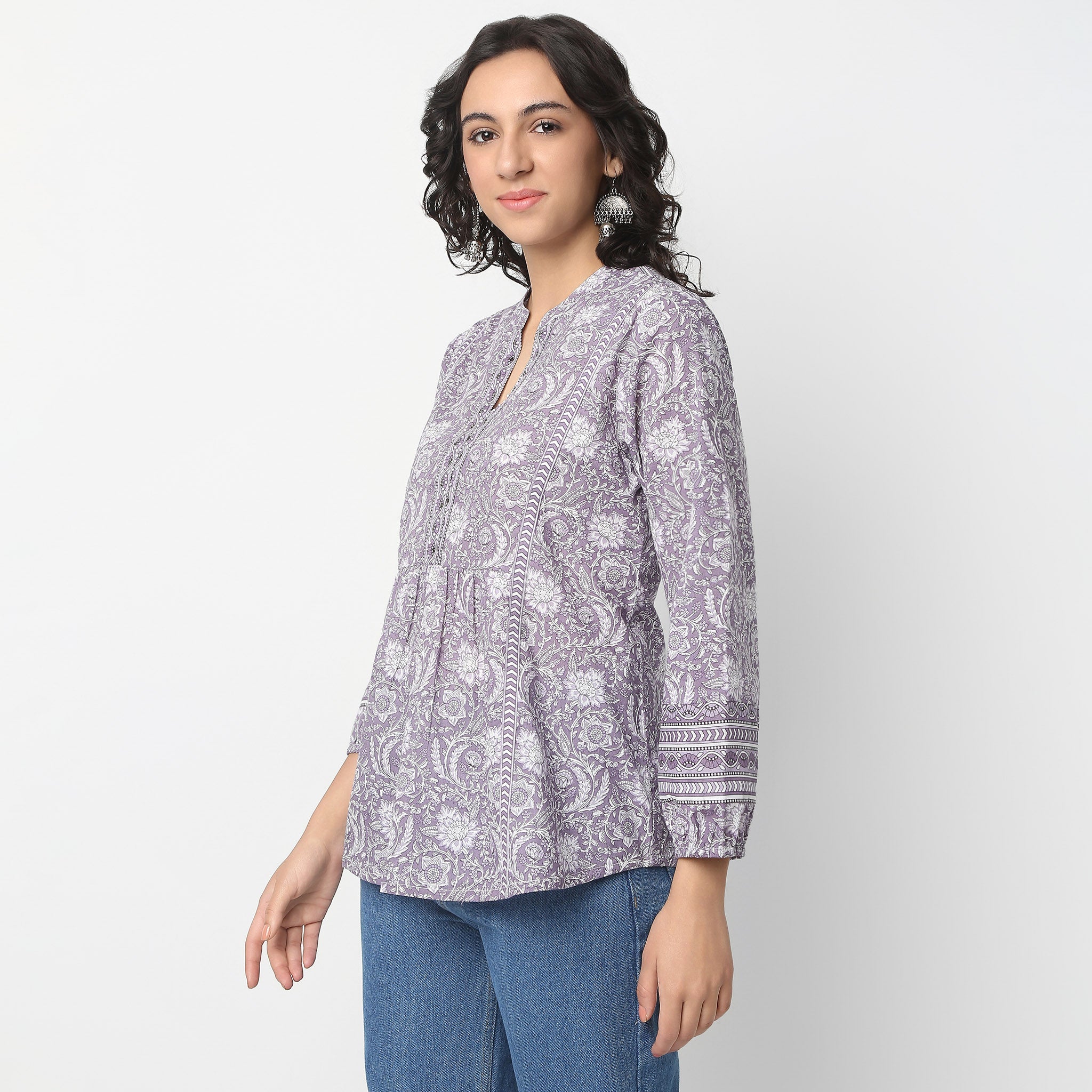 Band Neck Above Knee Three-Fourth Sleeve Flare Fit Printed Short Kurta