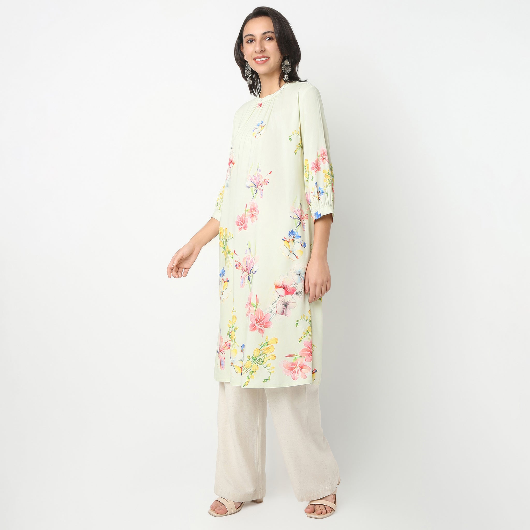 Experience the perfect blend of comfort and style with our Flare Fit Printed Band Neck Kurta. Crafted from 100% Rayon, this kurta offers a soft and breathable feel, ensuring you stay comfortable all day long. The elegant printed pattern and gathered cut shape add a touch of sophistication, making it a versatile piece for any occasion.