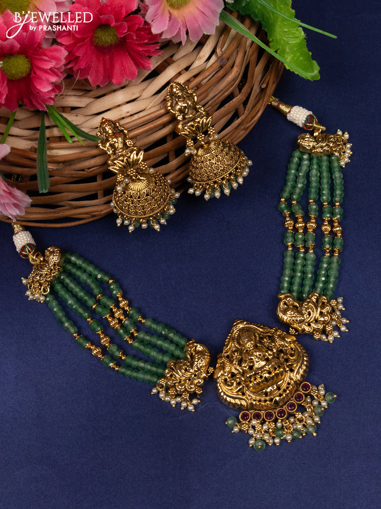 Antique beaded haaram lakshmi pendant with kemp stones and pearl & green beads hanging