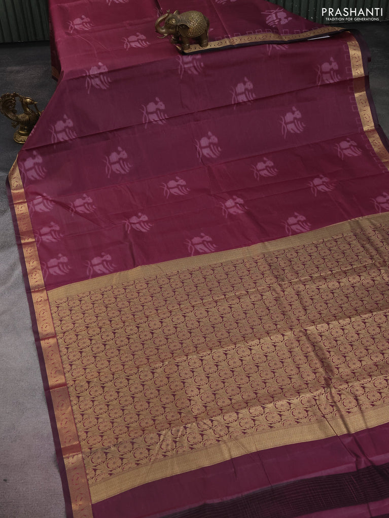 Bangalori semi silk saree wine shade with allover ikat butta weaves and zari woven border