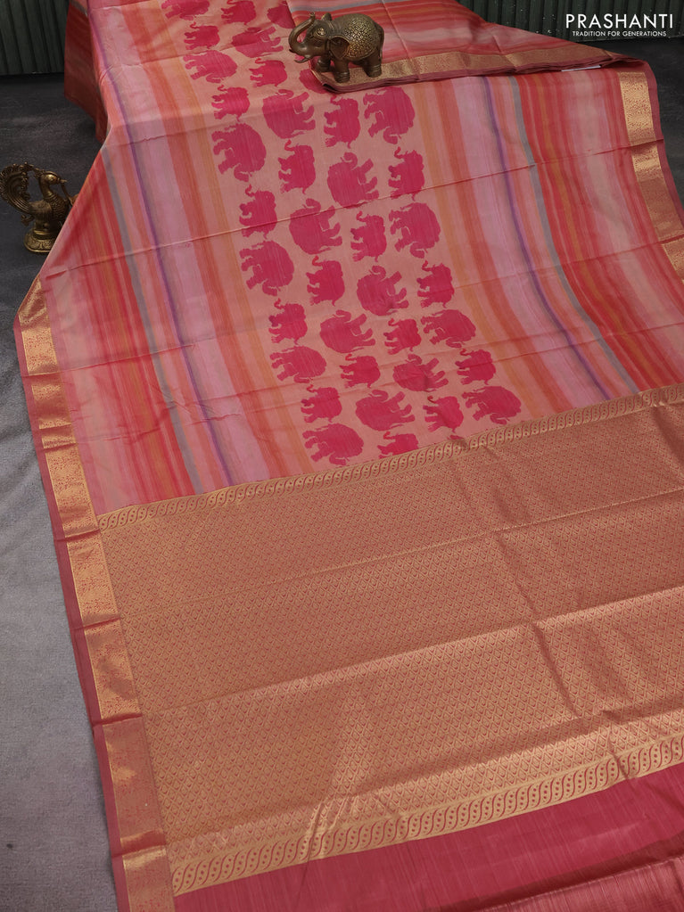 Bangalori semi silk saree sandal pink and maroon with allover elephant butta ikat weaves and zari woven border