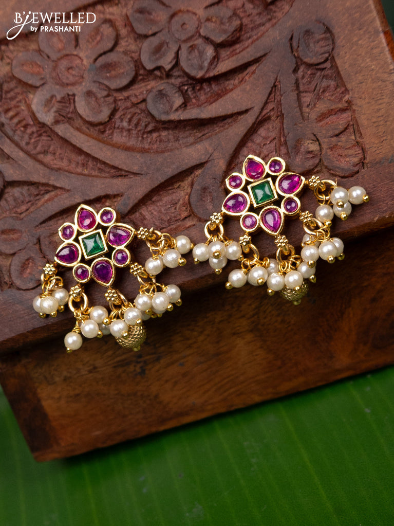 Antique earring with pink kemp & cz stones and golden beads hanging
