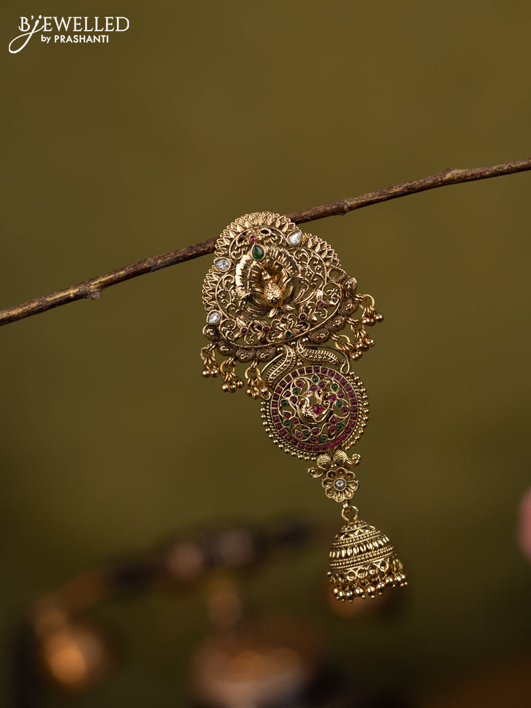 Antique jhumka lakshmi design with kemp stones and golden beads hanging