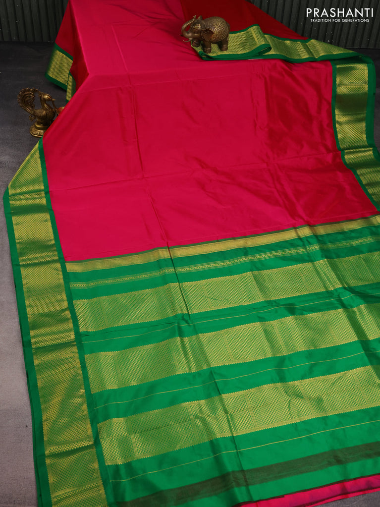 10yards pure silk saree bottle green and pink with plain body and temple design rettapet zari woven border