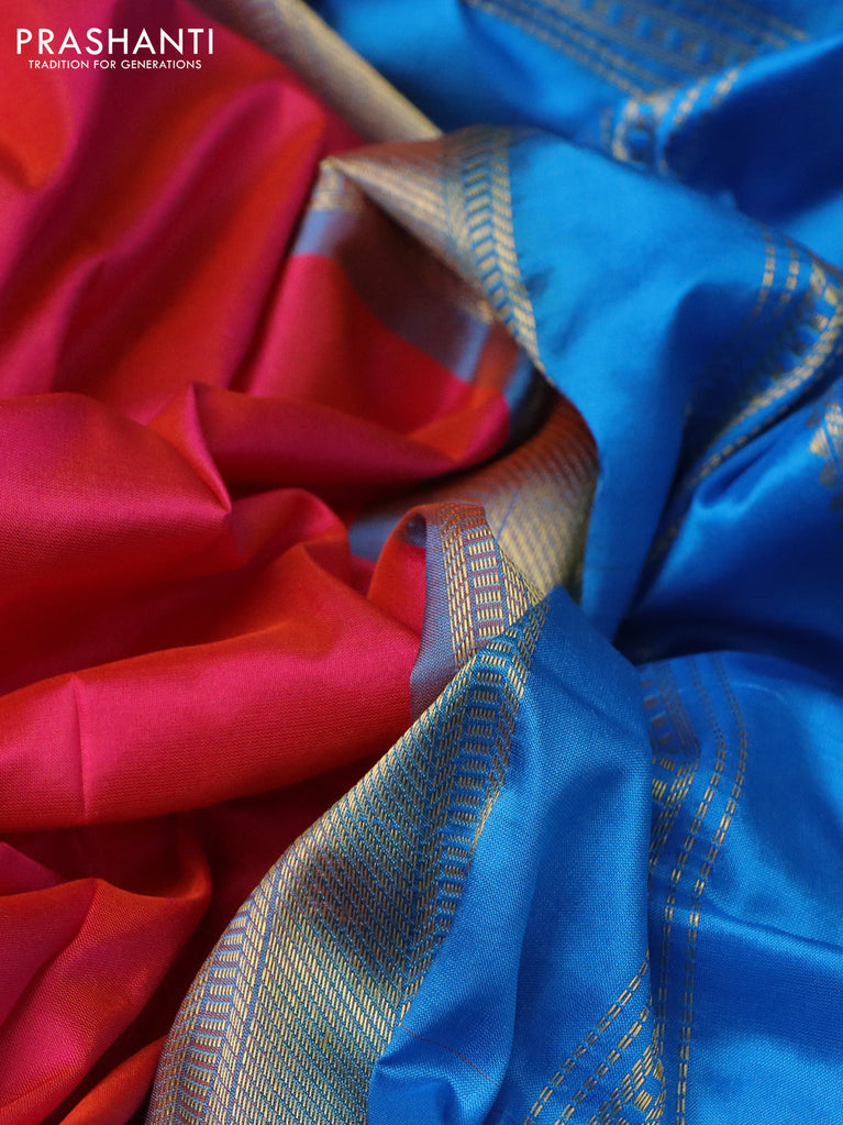 10 yards silk saree teal green and red with plain body and temple design zari woven border