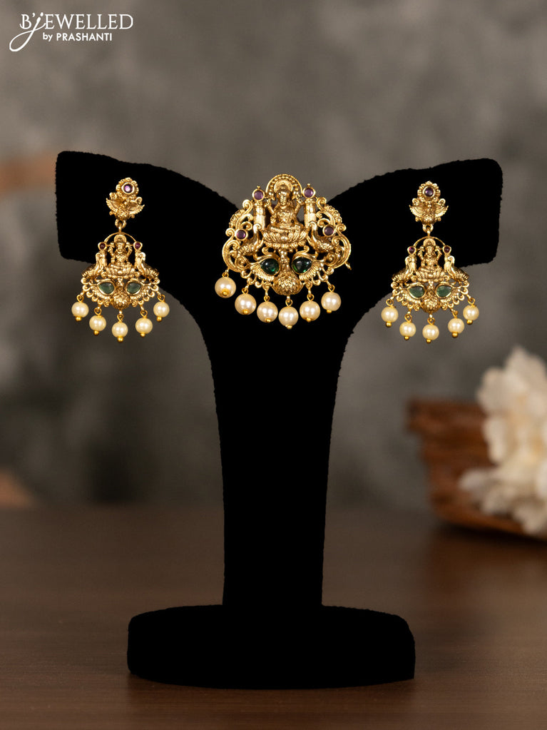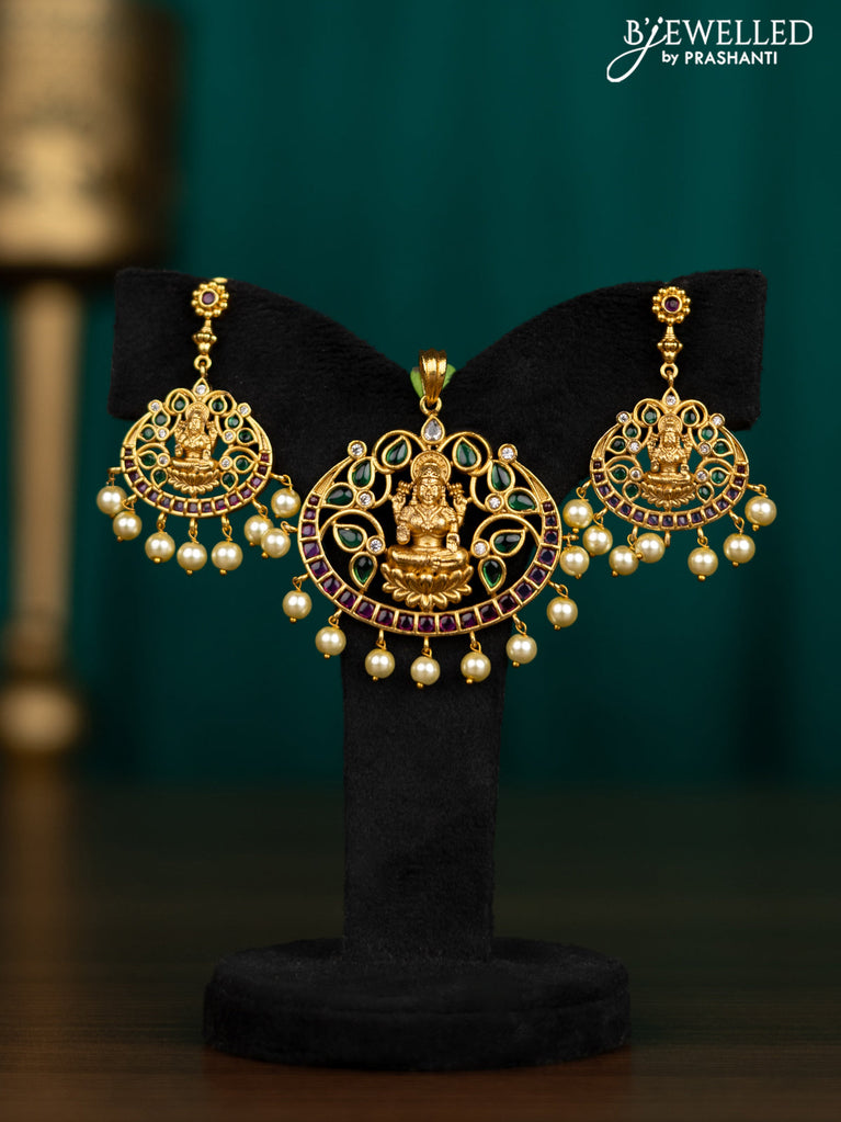 Antique pendant set lakshmi design with kemp & cz stones pearl hangings