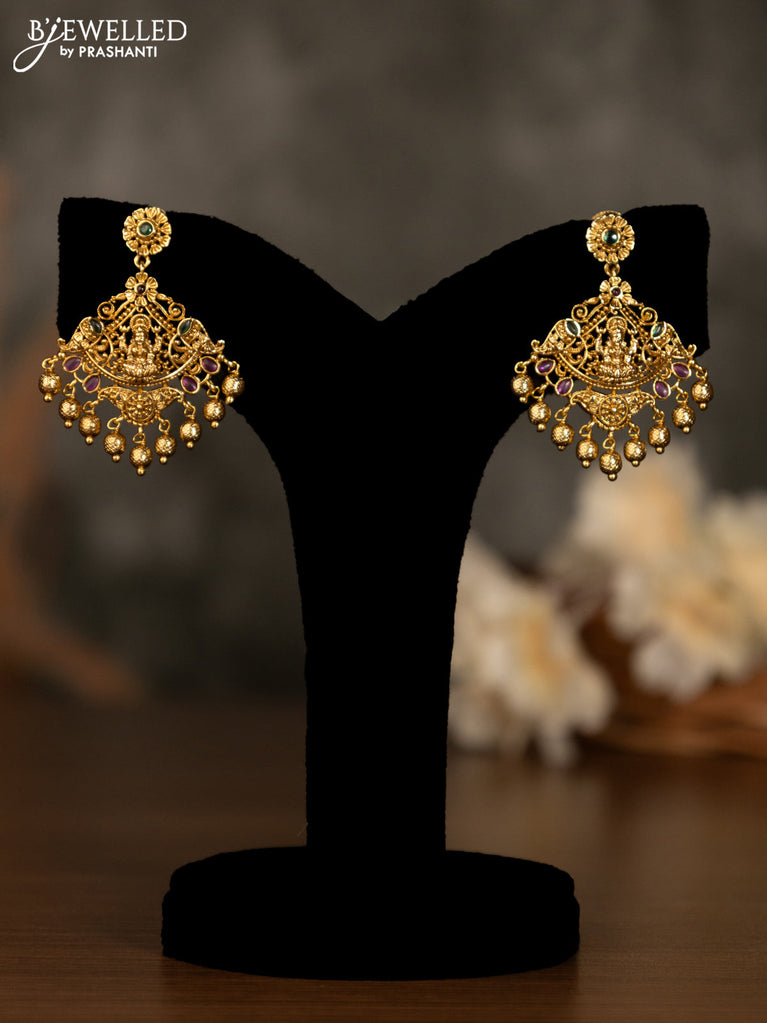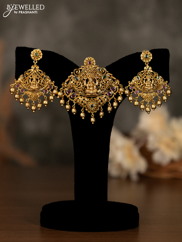 Antique pendant set lakshmi design with kemp stone and golden beads hangings