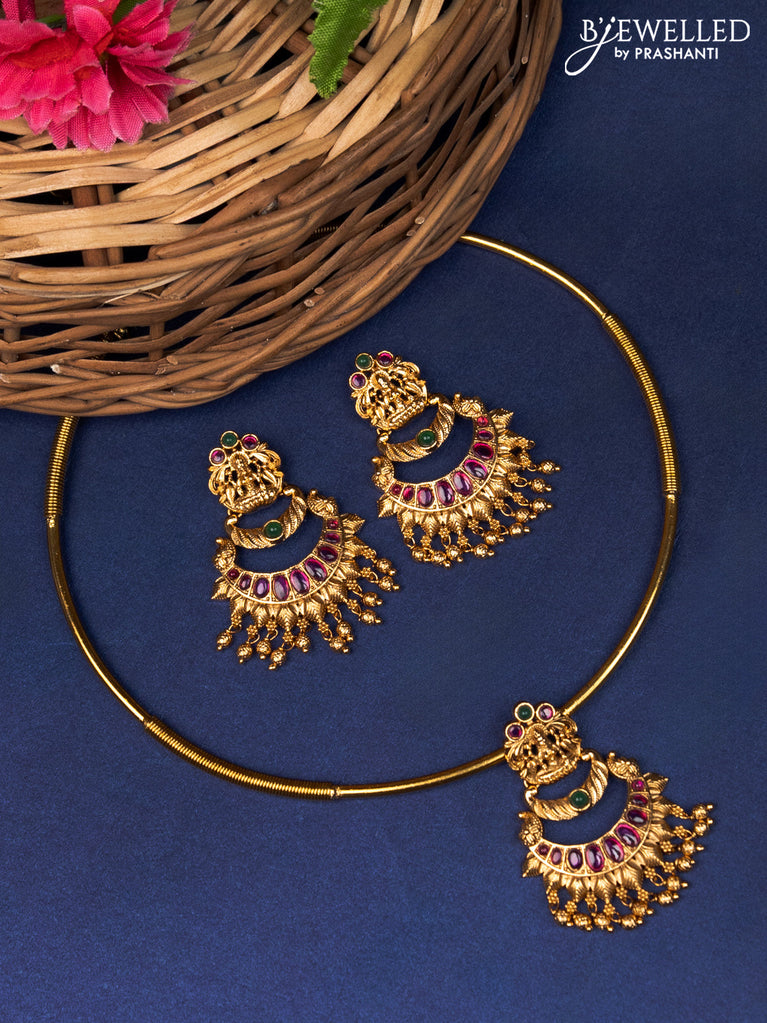 Antique ring type choker lakshmi design with kemp & cz stones and gold beads hangings