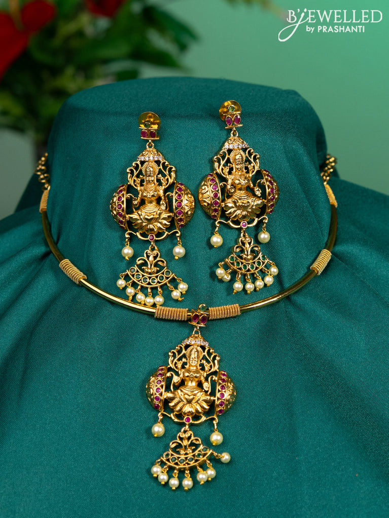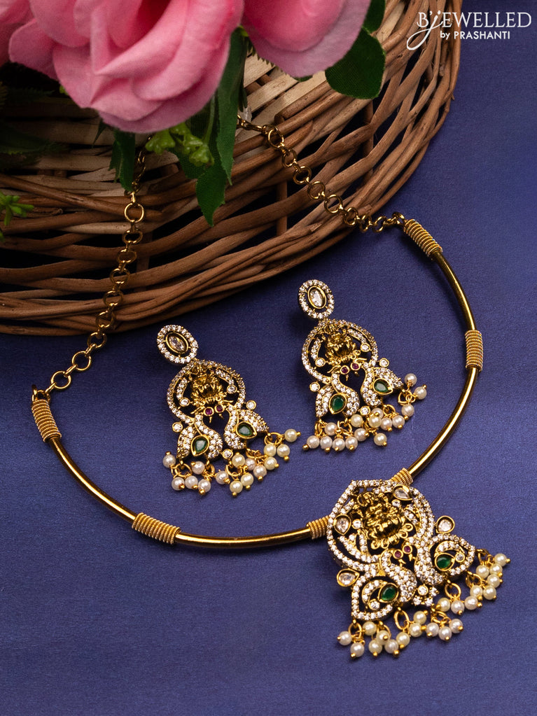Antique ring type choker lakshmi design with kemp & cz stones and pearl hangings