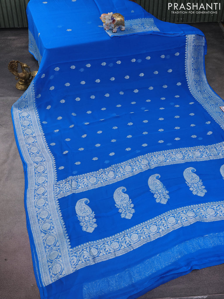 Banarasi chiffon silk saree cs blue and blue with paisley silver zari woven buttas and floral silver zari woven border