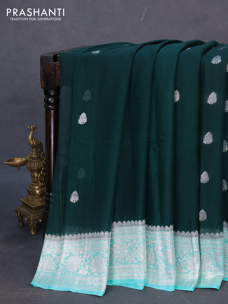 Banarasi chiffon silk saree bottle green and teal blue with silver zari woven buttas and silver zari woven border