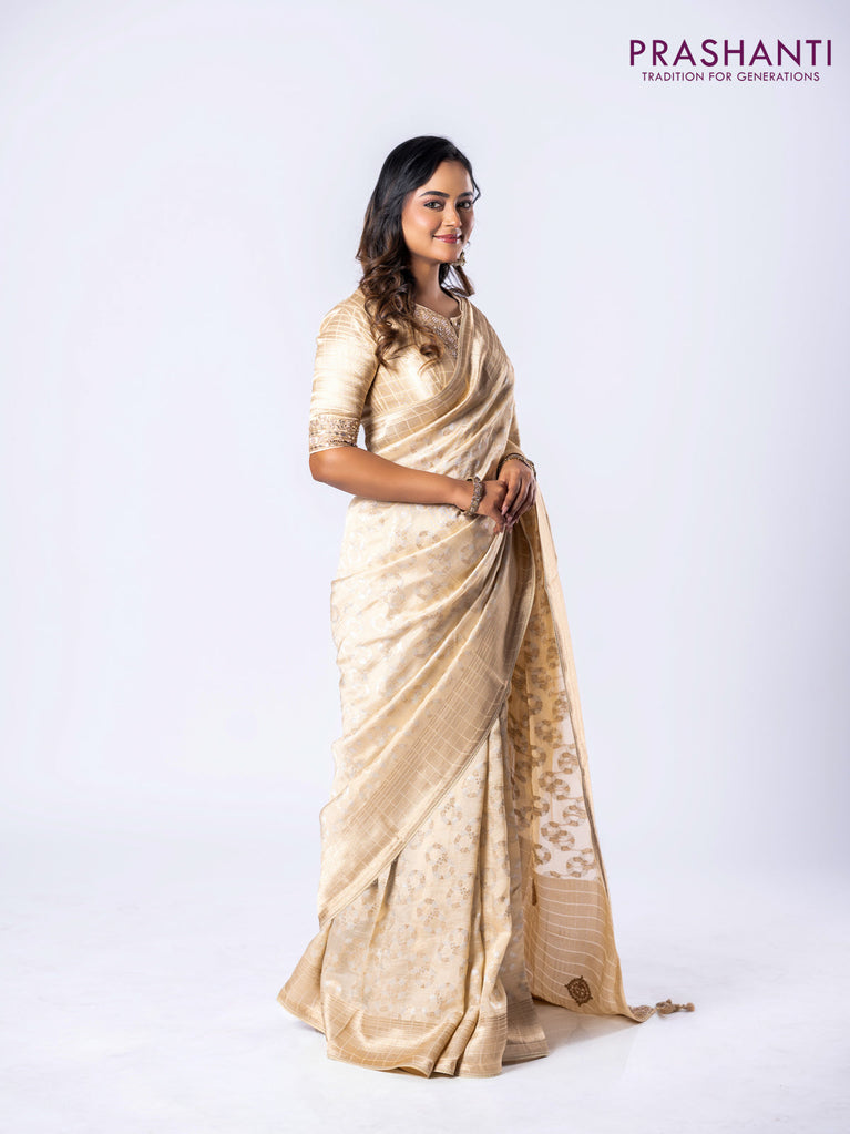 Banarasi munga silk saree cream with allover silver & gold zari weaves and zari woven lace border