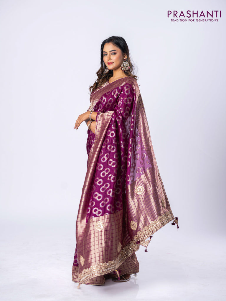 Banarasi matka tissue saree wine shade with allover zari weaves and temple deisgn zari woven border