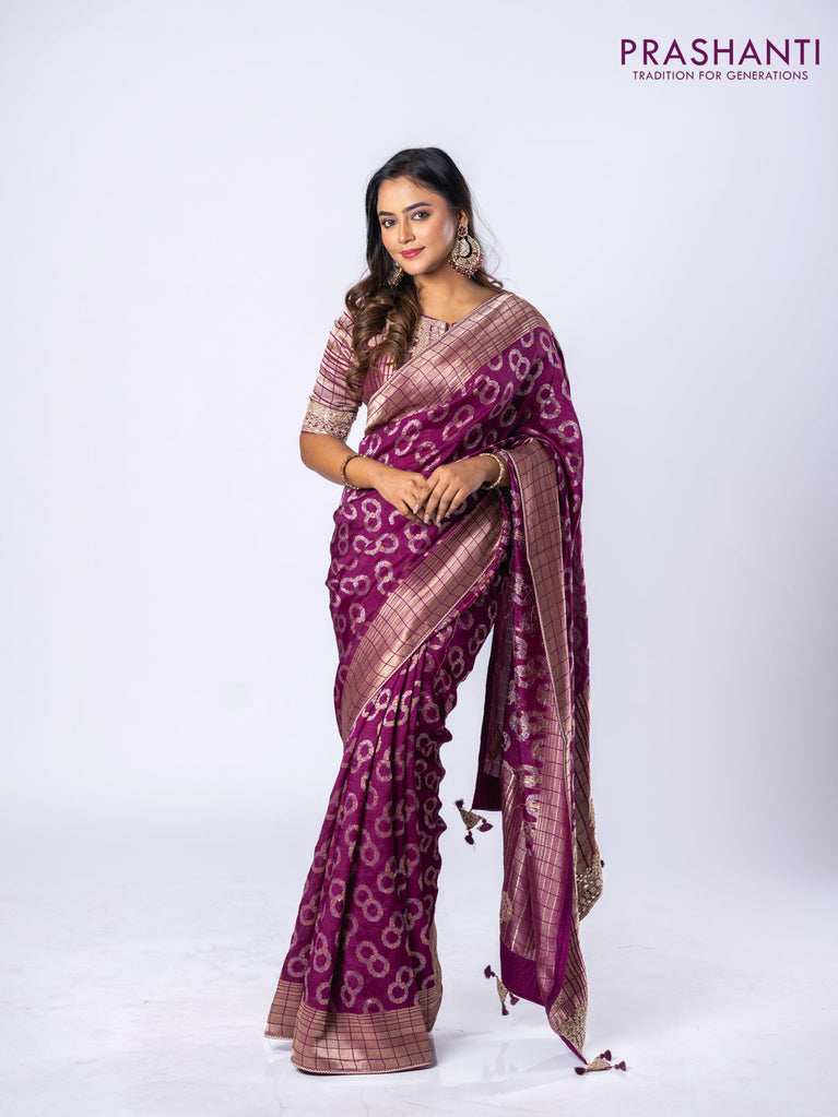 Banarasi munga silk saree purple with allover silver & gold zari weaves and zari woven lace border
