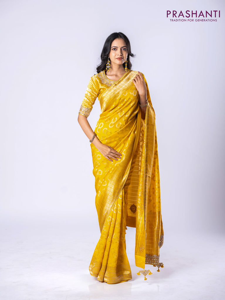Banarasi munga silk saree yellow with allover silver & gold zari weaves and zari woven lace border