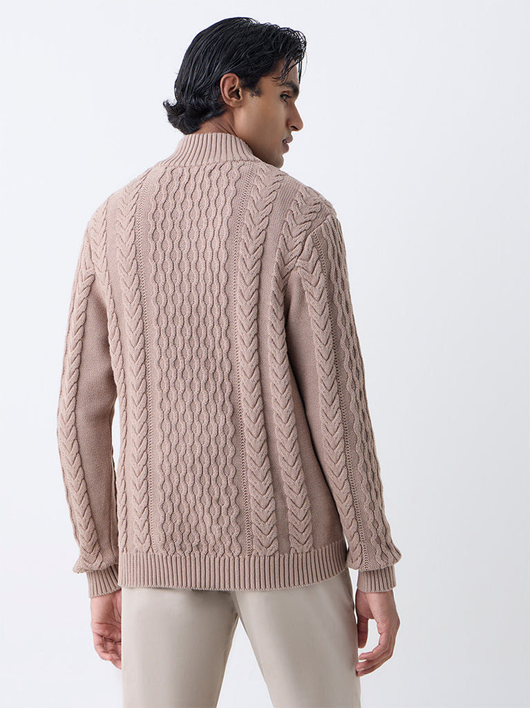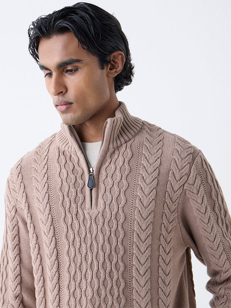 Ascot launches this beige sweater crafted from pure cotton with a cable-knit pattern that delivers softness and depth to the design. Designed with a high neck, a short zipper closure, and full sleeves, it balances function with clean style. A polished winter staple, it offers warmth and sophistication for effortless everyday layering.