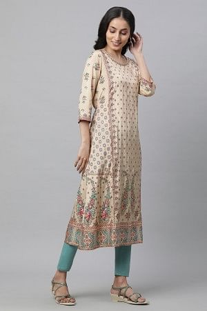 Simple yet classy, get this pretty cotton casual kurta in floral print and be the head tunner. It features straight silhouette, round neckline and three-quarter sleeves to give an elegant look.