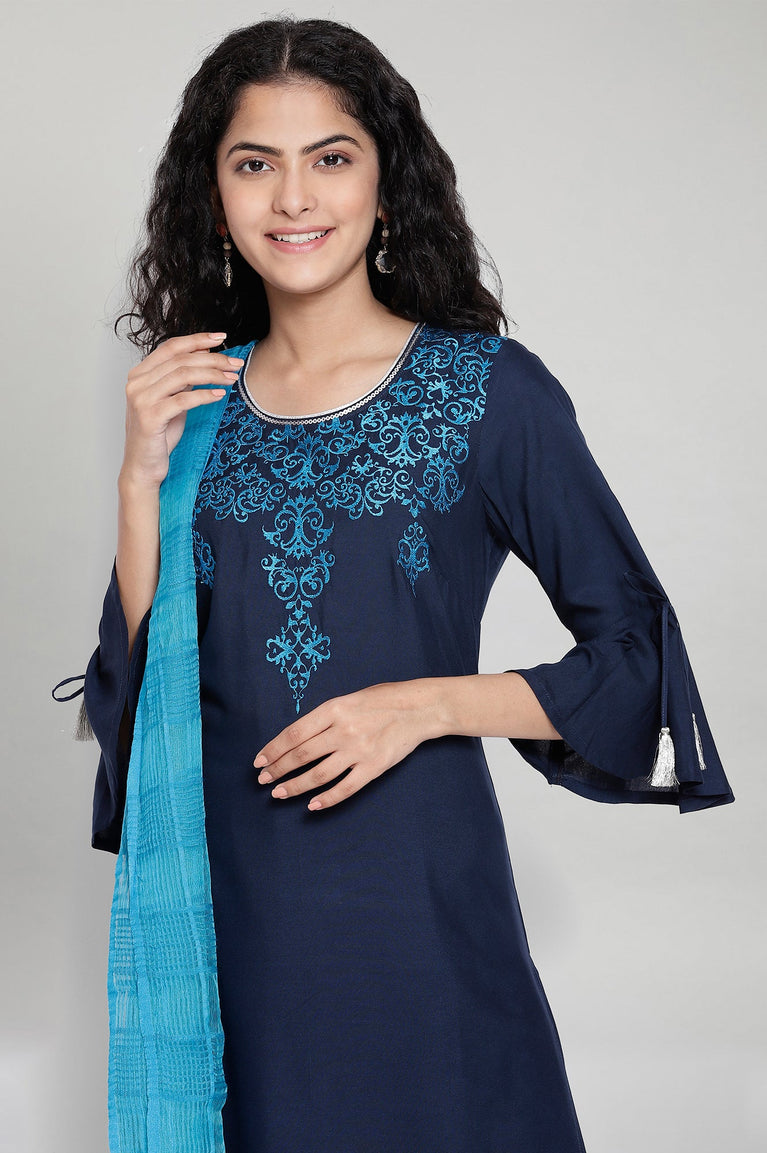 Blue Embroidered kurta-Trousers-Blue Dupatta Set