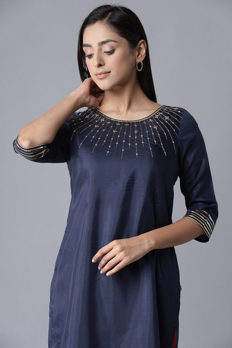 Blue round neck kurta having three-quarter sleeves and thread embroidery at front. Paired with solid blue trousers and dupatta.