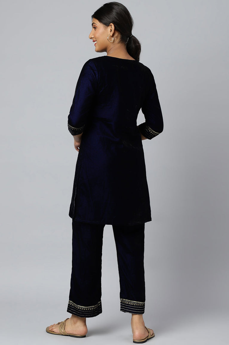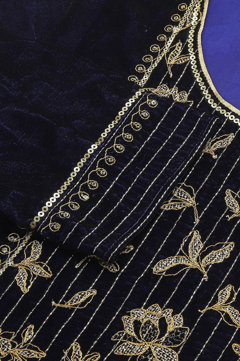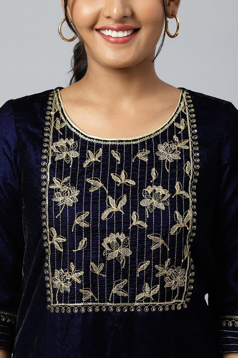 This Light Festive kurta Set Will Make A Gorgeous Addition To Your Ethnic Wear Wardrobe. Crafted In Premium Poly Shantung Fabric, This Zari Embroidered, Indigo kurta With Sequin Detailing Is Surely A Limelight Stealing Deal. It Comes With Ankle Length Palazzos Having Floral Print And Mid-Rise With Elasticated Waistband.
