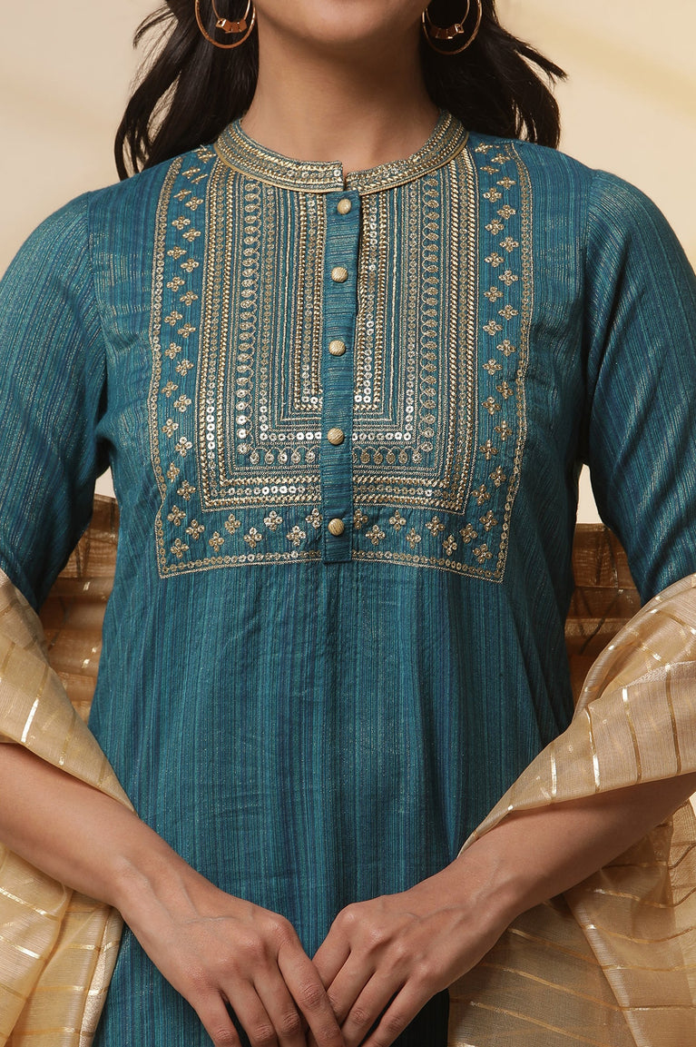Blue Embellished Lurex Stripes Kurta, Trousers and Dupatta Set