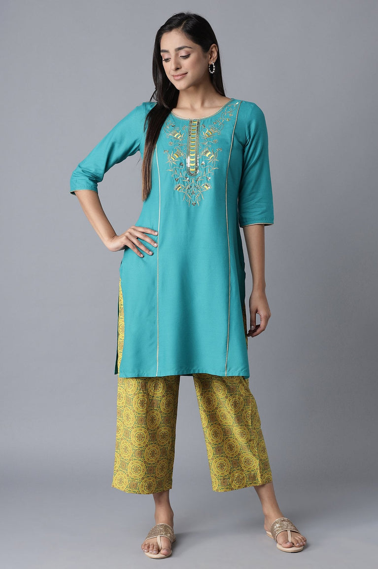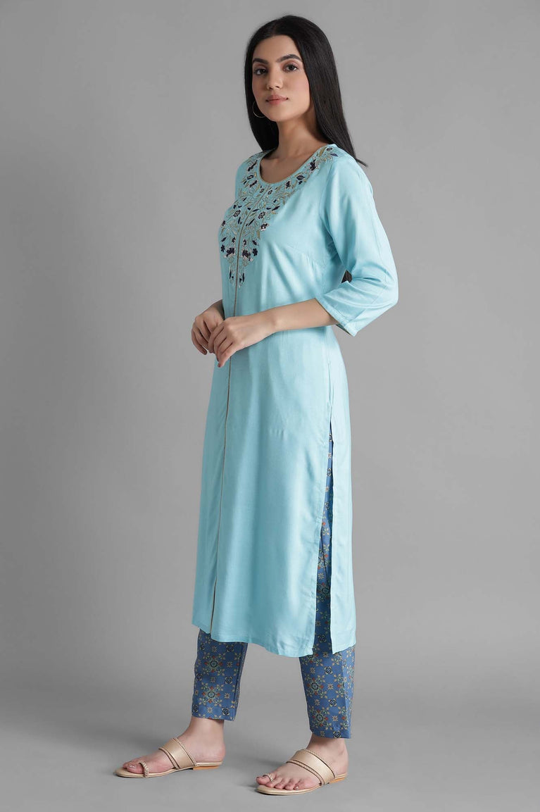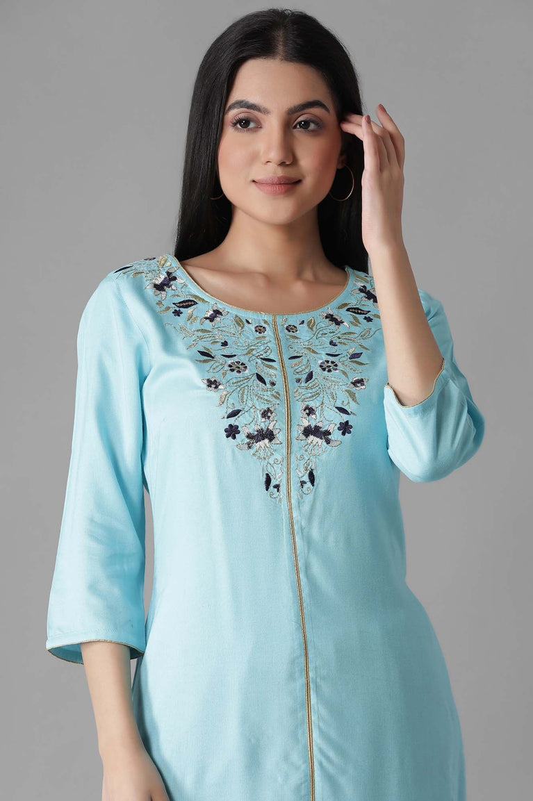 Blue coloured solid straight kurta having zari embroidery, round neck type and three-quarter sleeves.