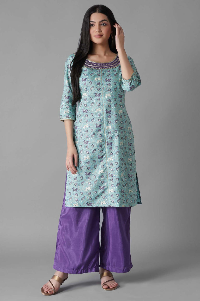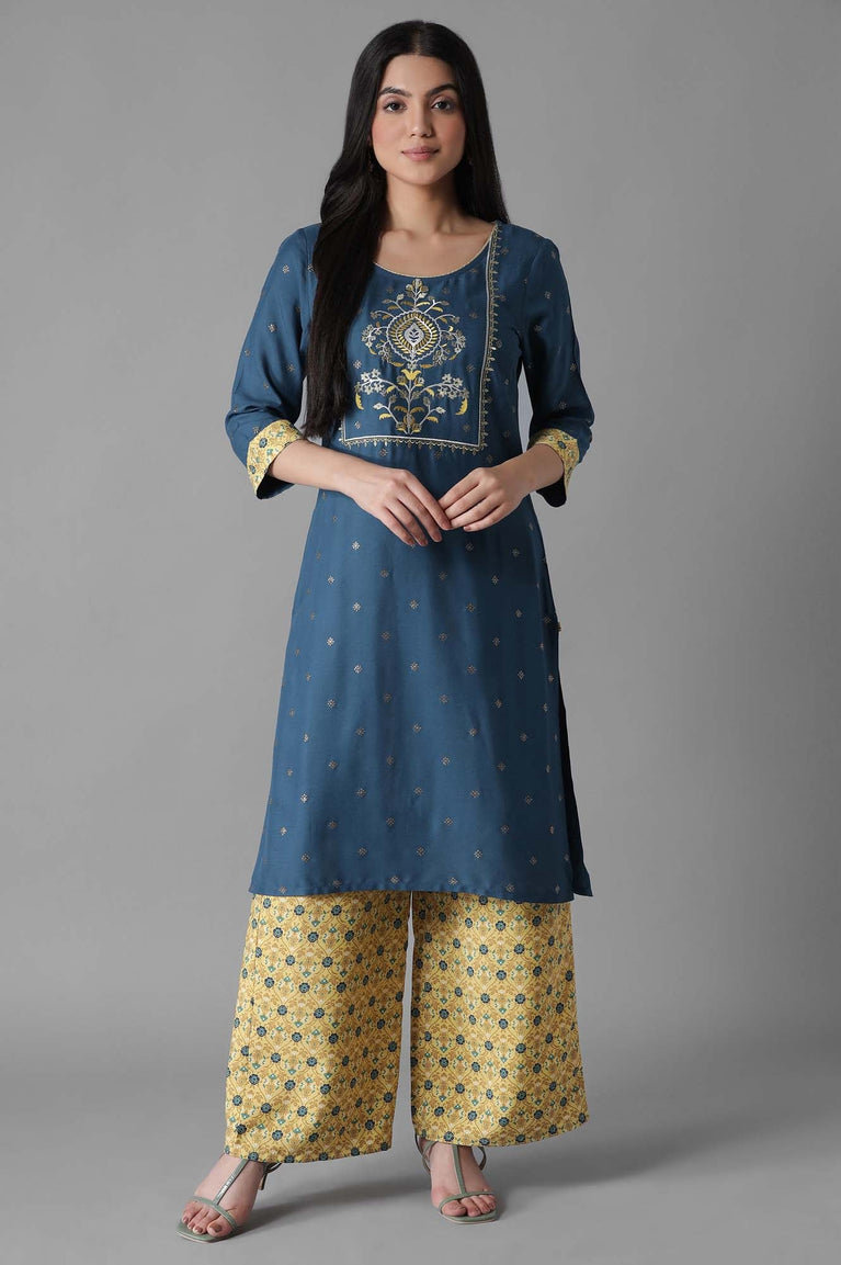 Dress up in the classic silhouettes with intricate detailing, traditional prints and rich hues to accentuate your festive look. This kurta set contains a blue glittered mughal print kurta featuring zari embroidered yoke with round neckline and three-quarter sleeves. Well-matched with contrasting ankle length printed palazzos.