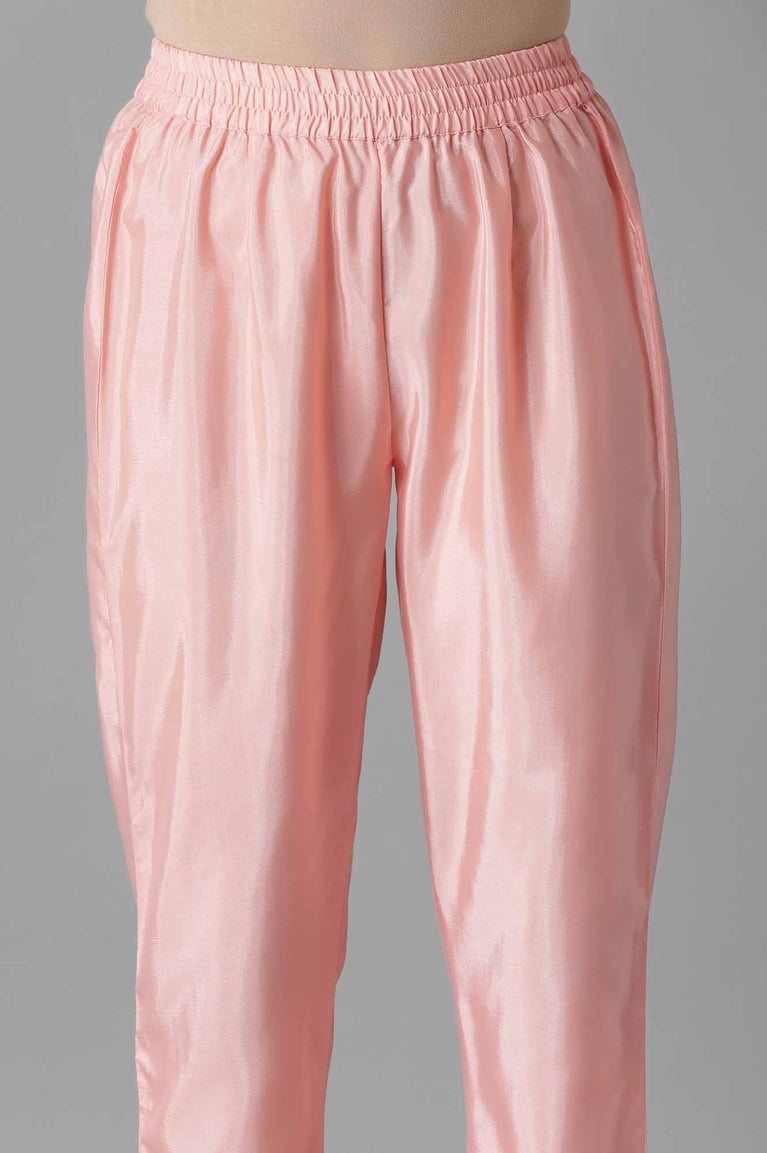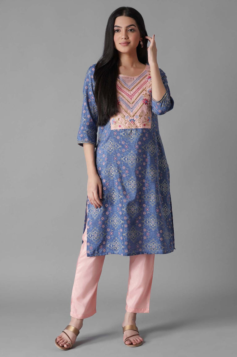 Dress up in the classic silhouettes with intricate detailing, traditional prints and rich hues to accentuate your festive look. This kurta set contains a blue glittered mughal print panelled kurta featuring zari embroidered yoke with round neckline and three-quarter sleeves. Well-matched with impatient pink ankle length solid trousers.