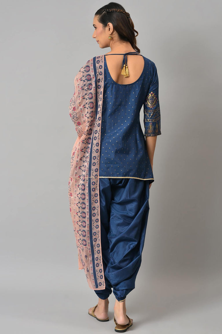 Blue Embroidered Short kurta with Dhoti Pants and Peach Dupatta
