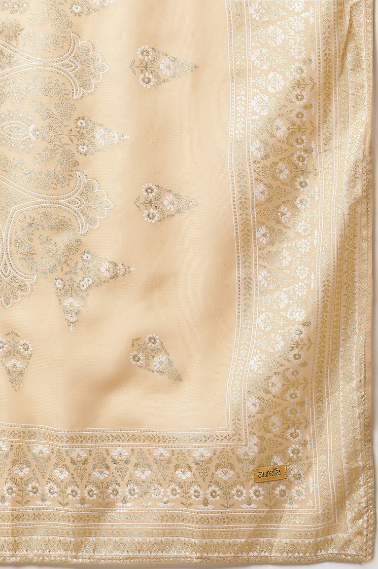 This wedding season is all about golds and glitter, if you are looking for something dramatic yet elegant than this is it! This 3 pieace set has a short kurta with placement gold print, with gathered flare skirt in crinkle effect and a autumn blaze colour dupatta.