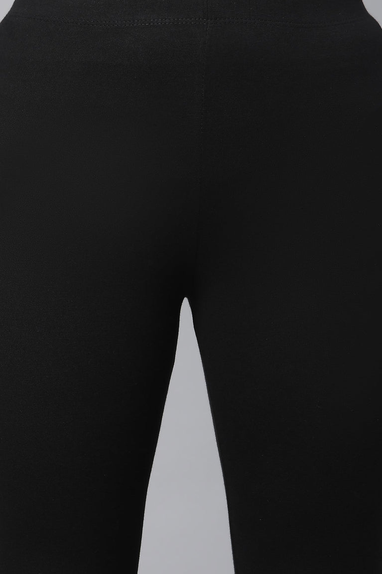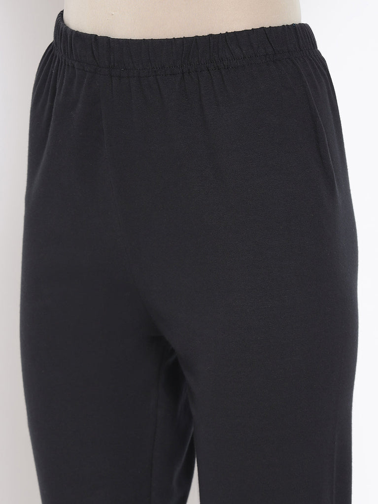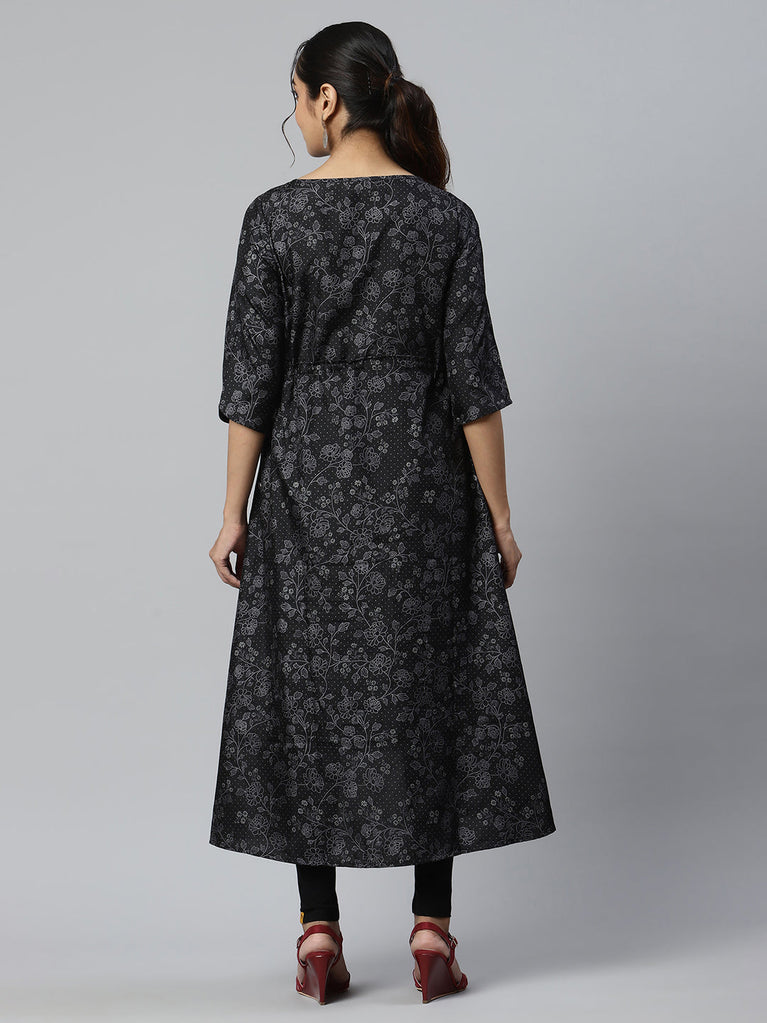 Get all attention on you with this pretty black flared kurta set. The set includes high-low kurta with drawstring tie-up on waist. It is paired with black solid tights.