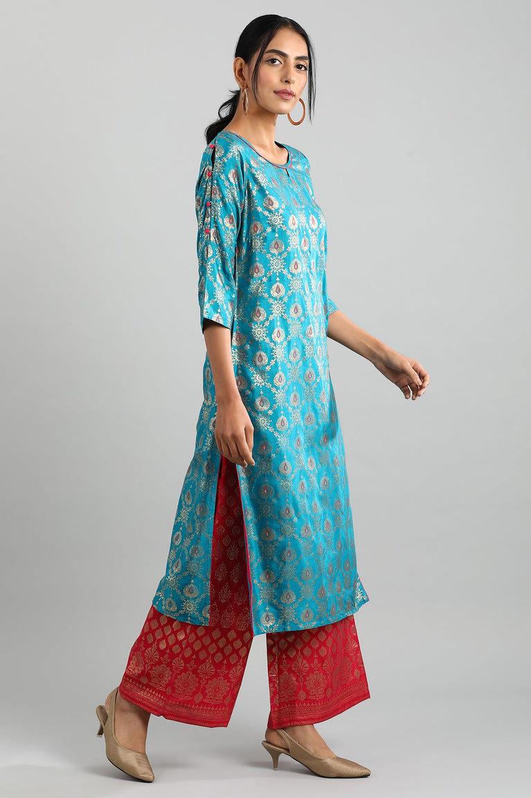 This blue round neck 3/4 sleeve kurta has printed detail and side slits.