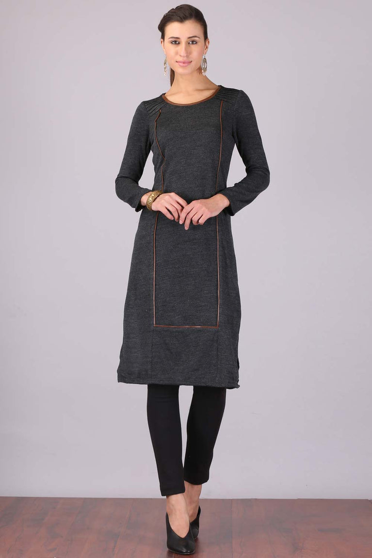 Black round neck full sleeve knitted kurta with zari embroidery detail and side slits.