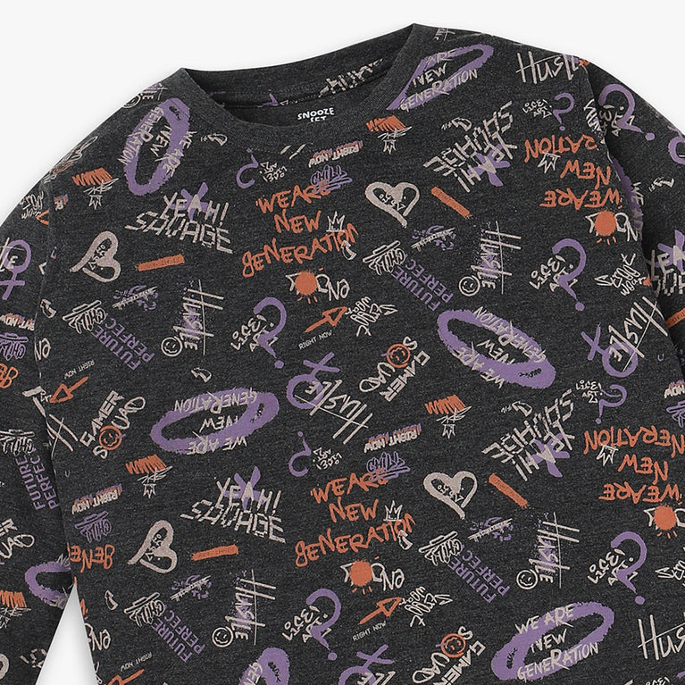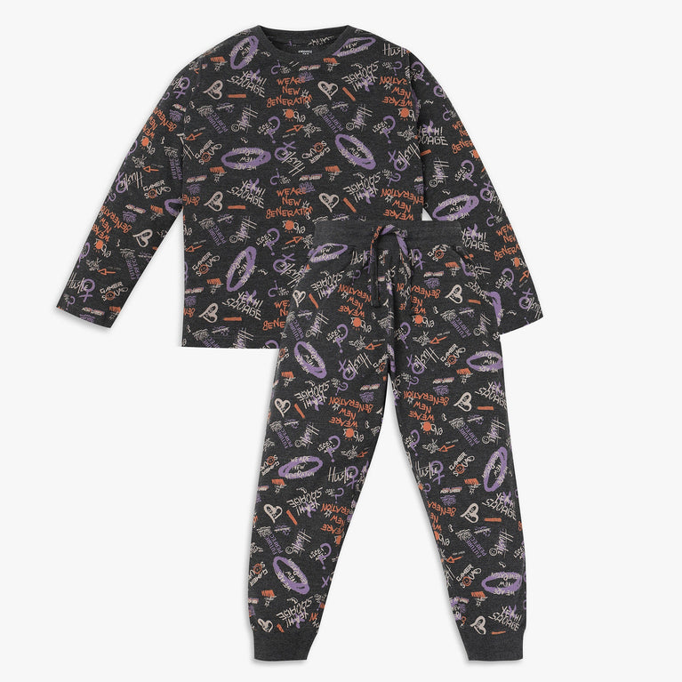 These printed pattern t-shirt with trackpant sleepwear set has crew neck and full sleeve. Made from cotton polyester, your kid's feel comfortable wearing the product.