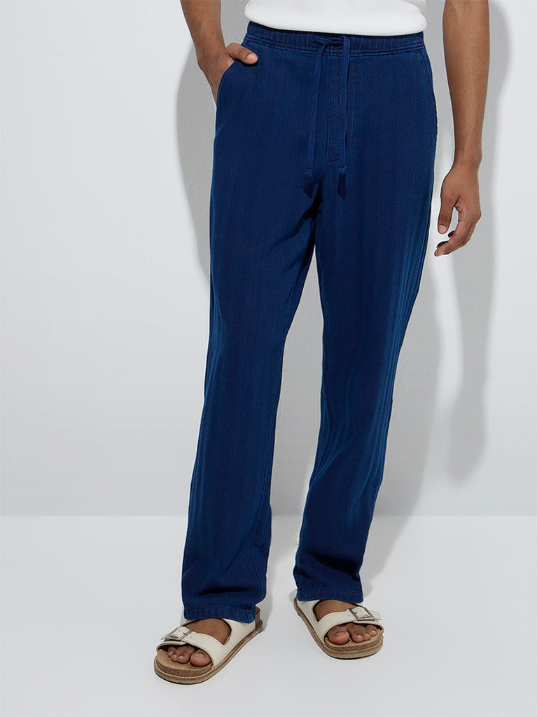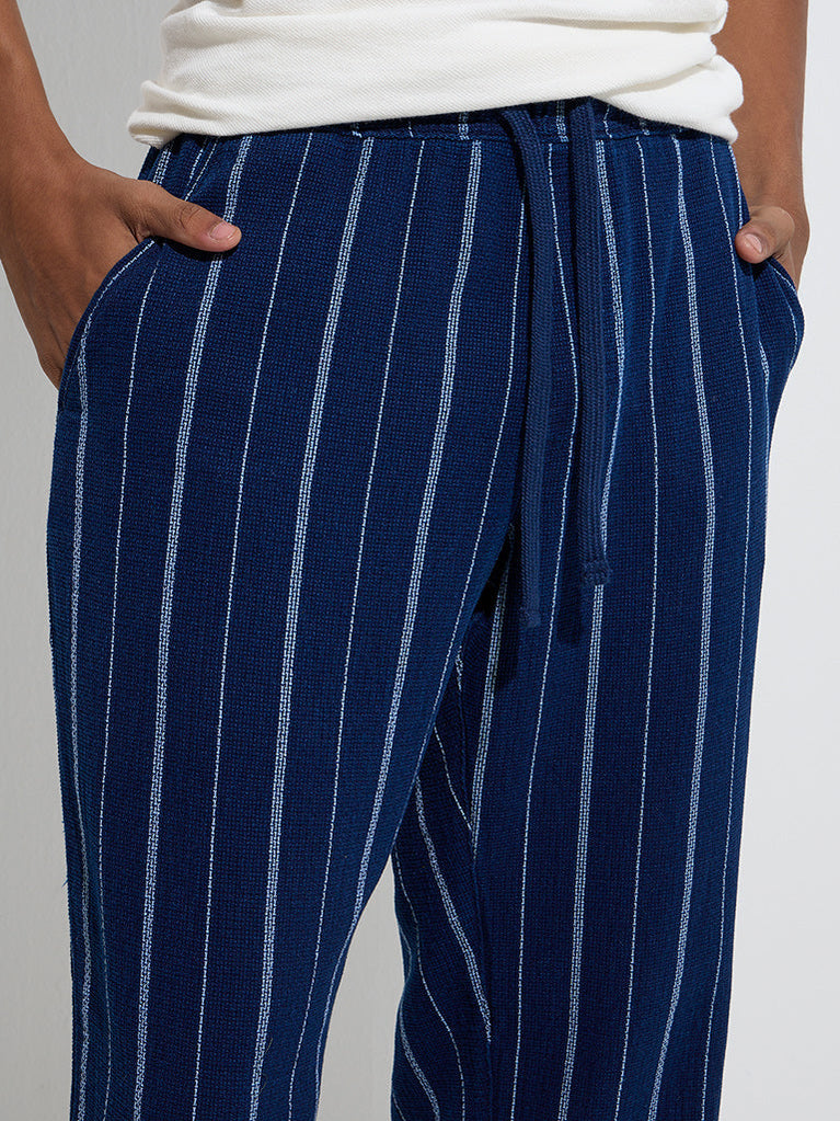 Step into casual ease with these indigo cotton trousers from ETA. Featuring a classic pinstripe pattern, they are crafted in a relaxed fit with a smooth elastic waistband, adjustable drawstrings, and multiple pockets for everyday comfort and functionality.