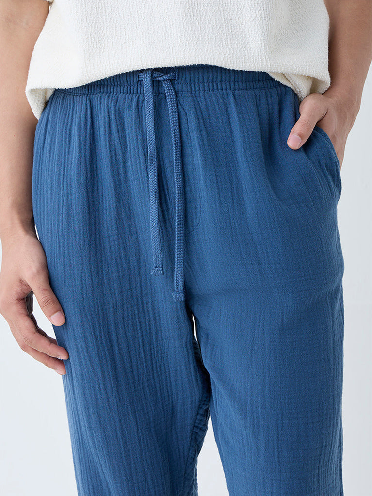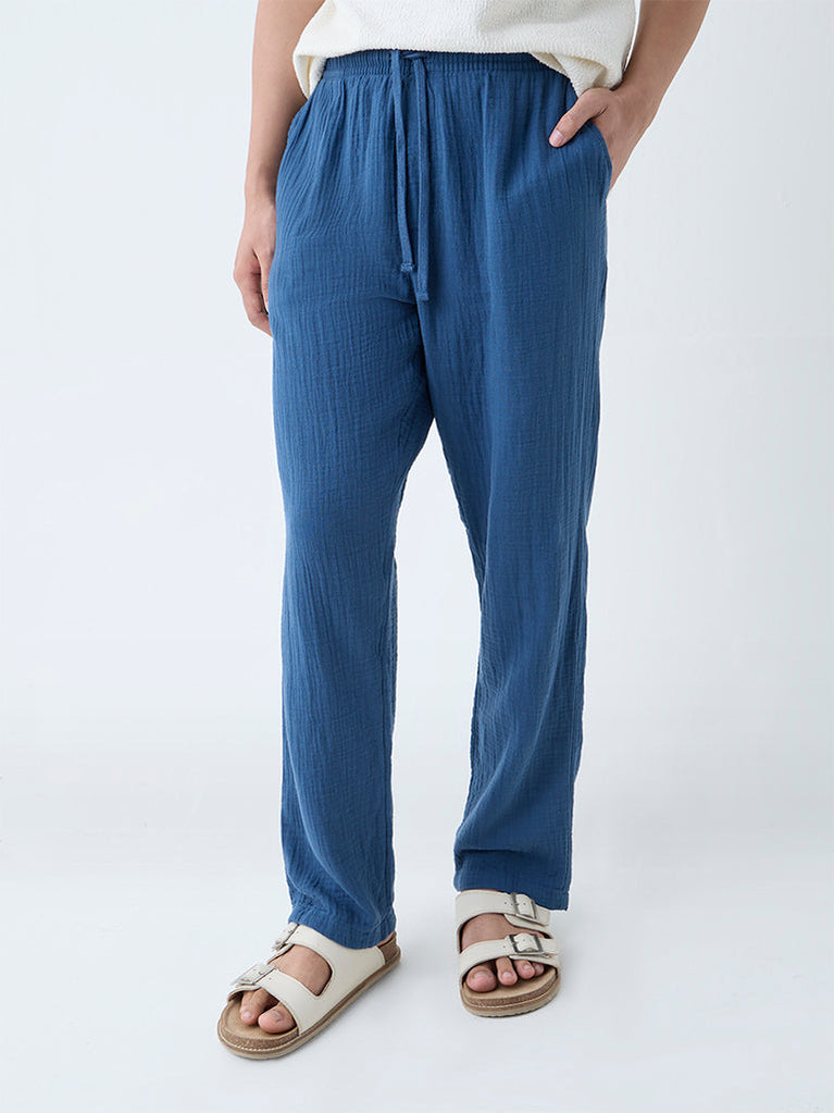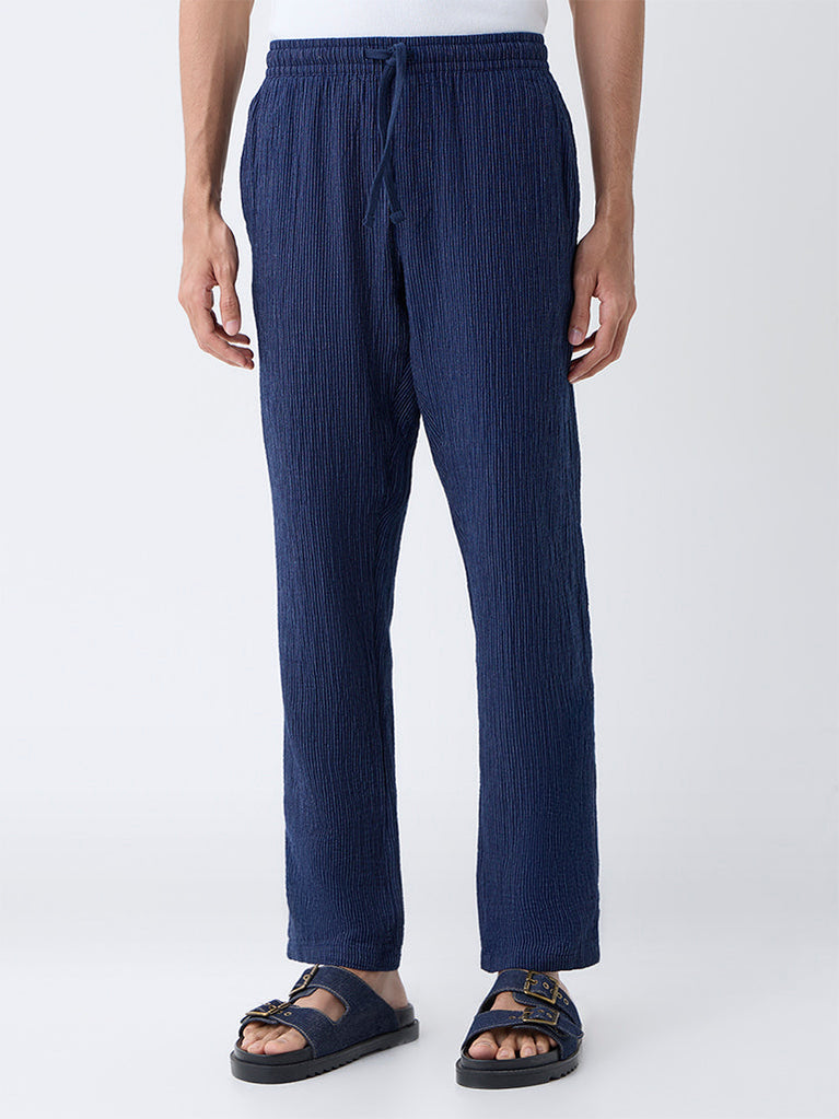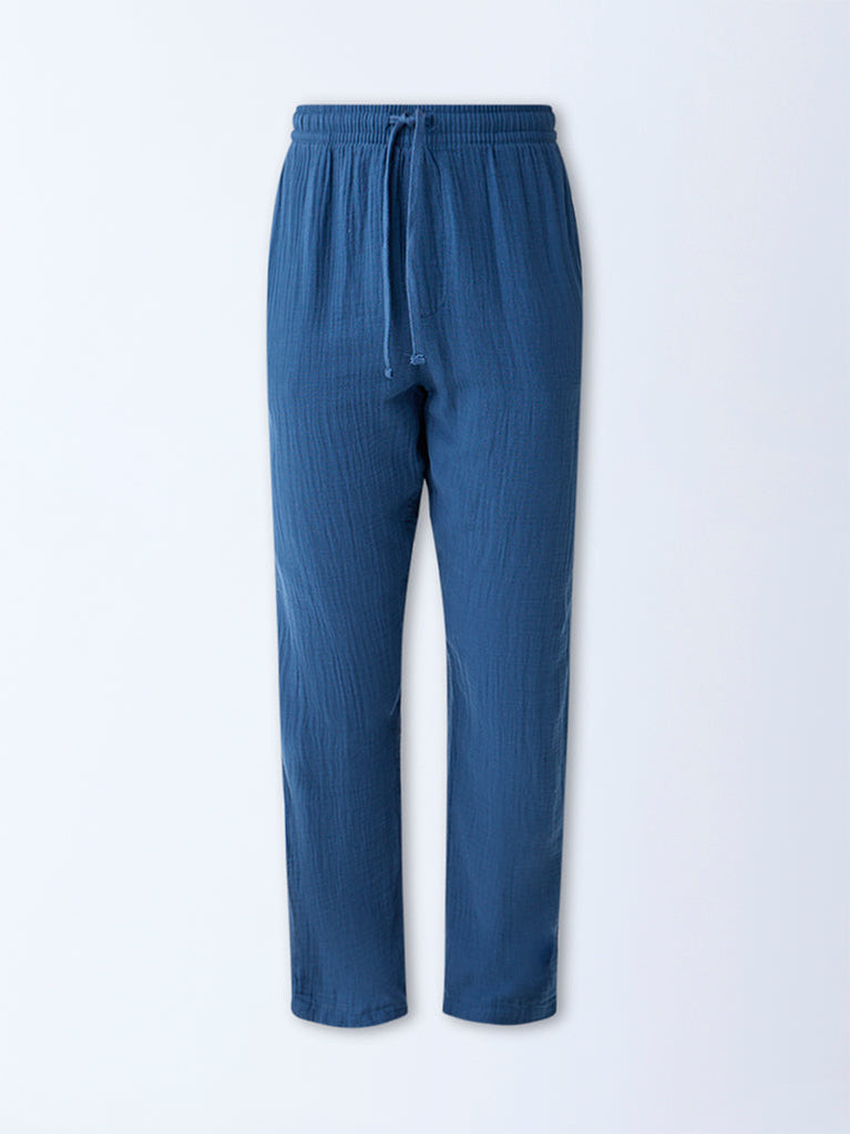 Own the weekend in these indigo chinos from ETA. Woven from a sumptuous fabric with a crinkle-textured finish, they offer all-day comfort without compromising on style. The elastic waistband with adjustable drawstrings ensures a perfect fit, while multiple pockets keep essentials close at hand.