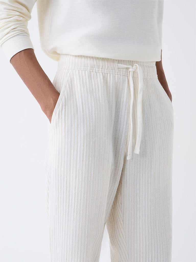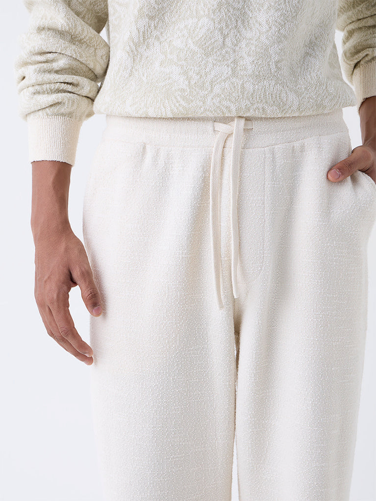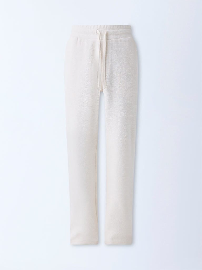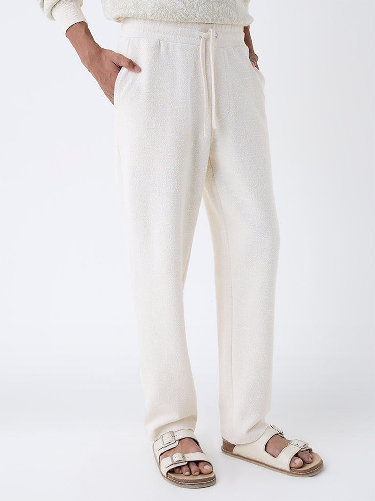 Mid-rise chinos, self-patterned, relaxed fit, pockets, off-white hue, elastic waistband with adjustable drawstrings by ETA.