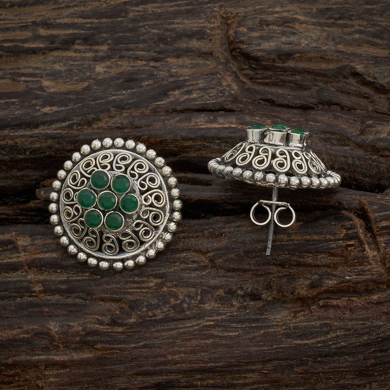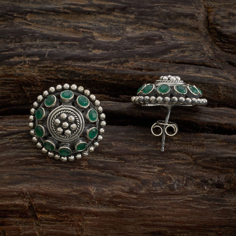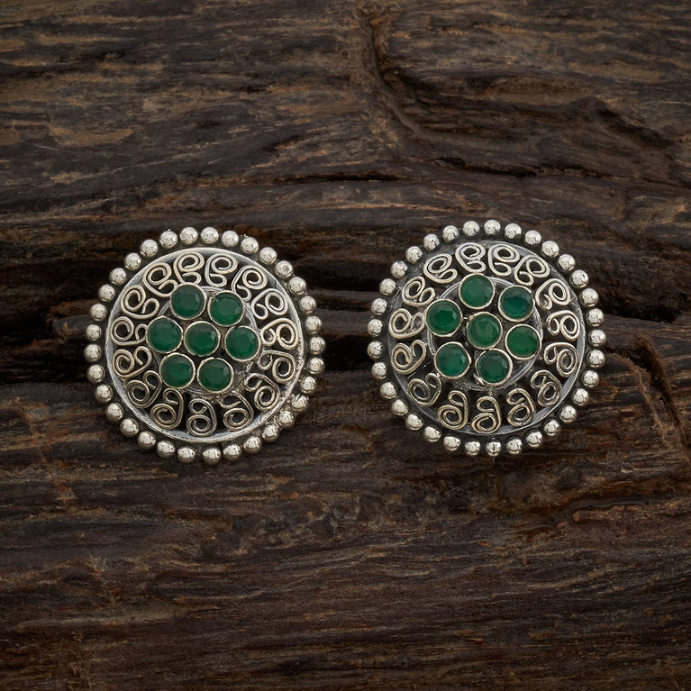 Kushal's Fashion Jewellery 92.5 Pure Silver Flower Motif Silver EarringThe best part of accessories with a polish of oxidised silver is that they blend well with traditional and fancy occasions, which is why we present our latest pair of 92.5 silver earrings in black polish. These stud earrings offer intricate work details with green and ruby stones, and the polish ensures to make all heads turn toward you.