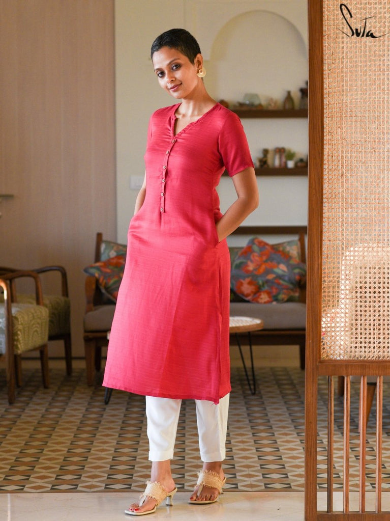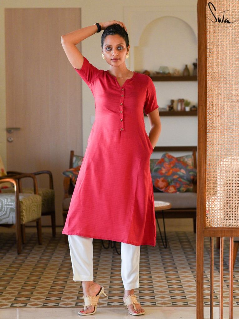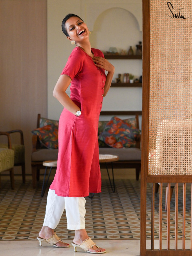 Question your perceptions when you’re wearing this gorgeous red and pink cotton dress.