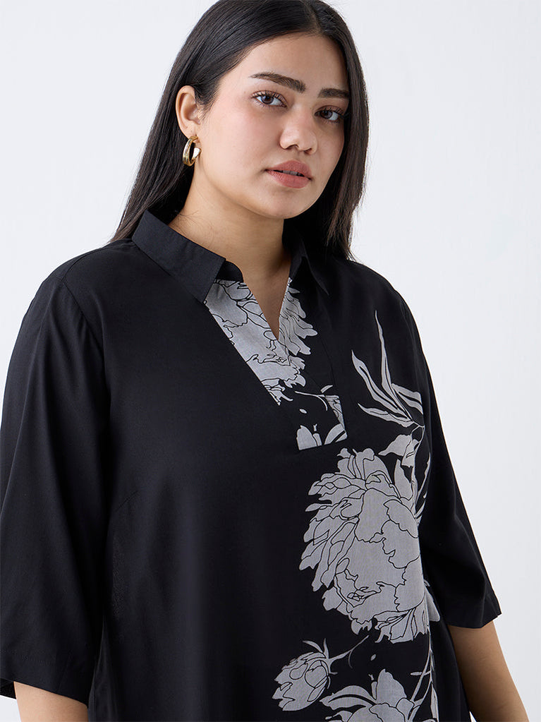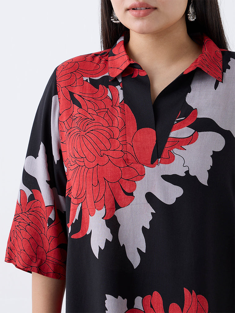 This black kurti from Diza is perfect for both casual and festive occasions. Designed with a flattering high-low silhouette in a smart shirt style, it boasts bold floral patterns for a touch of elegance. Pair with matching palazzos (sold separately) for a polished look.