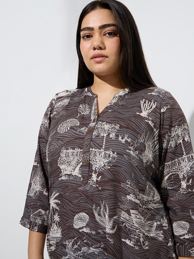 Diza launches this brown ethnic kurti, spun from a lightweight fabric for effortless daytime dressing. Showcasing scenic prints all over, it is designed with a mandarin neck, a brief button placket, and three-quarter sleeves, blending classic details with comfortable style.