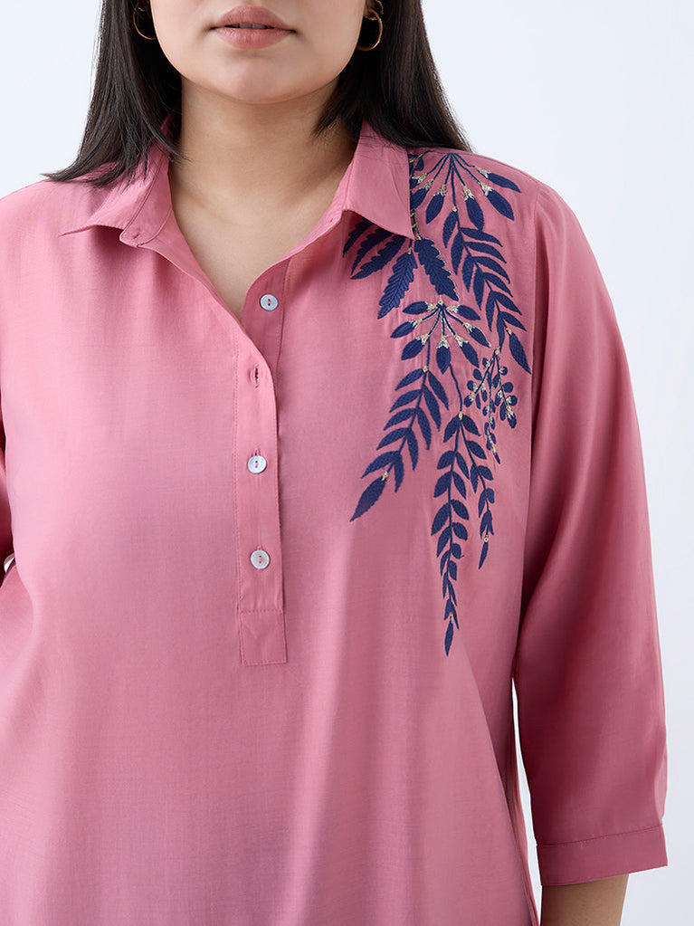 This dusty pink kurta from Diza is tailored in a graceful A-line silhouette. Milled from an ultra-lightweight fabric, it flaunts leaf embroidery for added style. A sharp collar flows into a buttoned placket, while three-quarter sleeves and a slip pocket complete the design with quiet functionality.