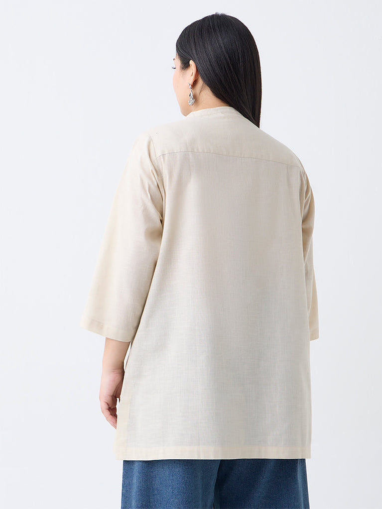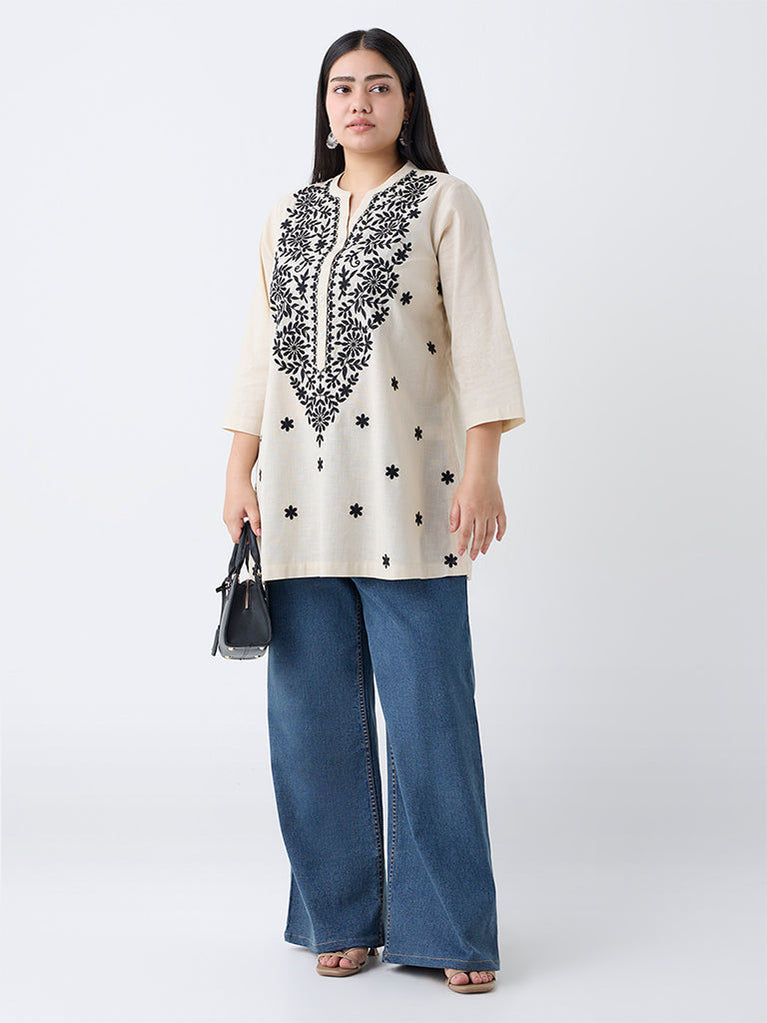 Diza introduces this cream kurti, highlighted by intricate floral embroidery across the yoke for a softly refined, elegant appeal. Created from pure cotton for all-day comfort, It is designed with a notched neckline and three-quarter sleeves, making it an effortless choice for understated festive moments.