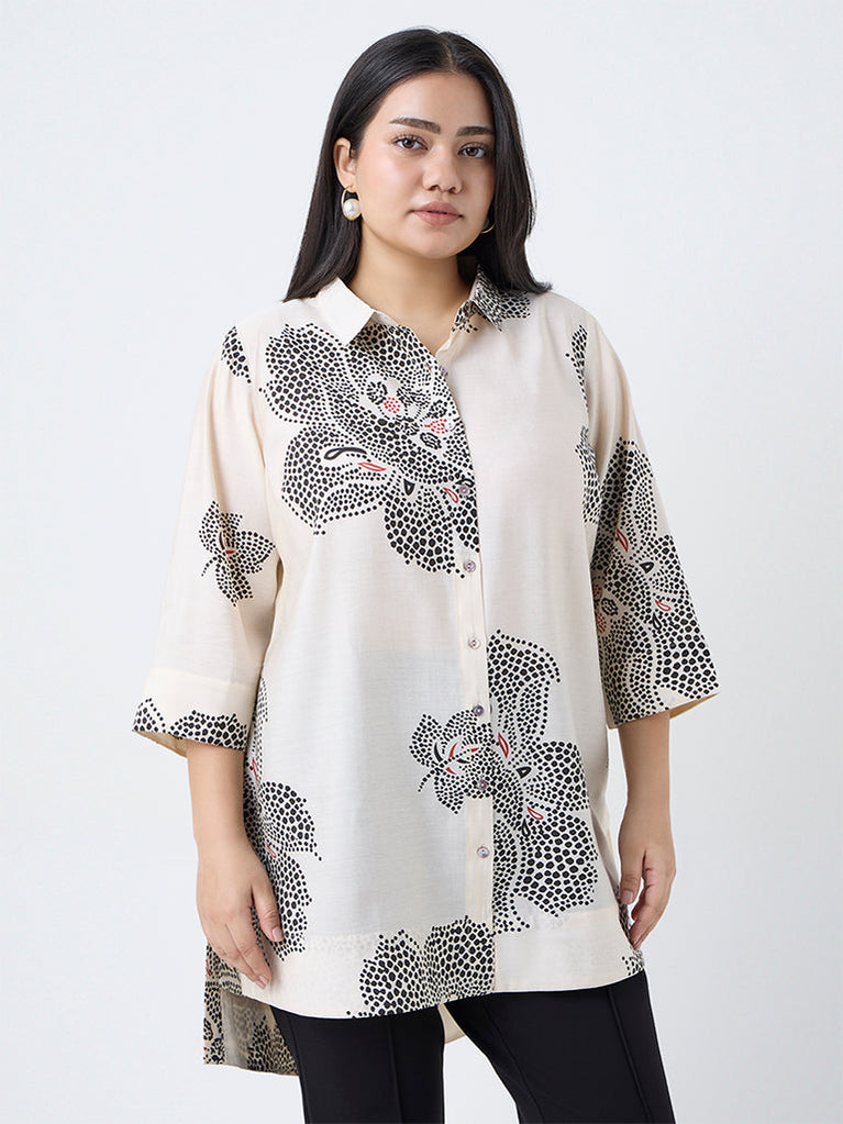 Decked with dainty floral motifs, this cream tunic from Diza brings a soft, contemporary edge to traditional styling. Made from breathable fabric, it features a structured collar, button-up front, three-quarter sleeves, and a high-low hemline for fluid movement.