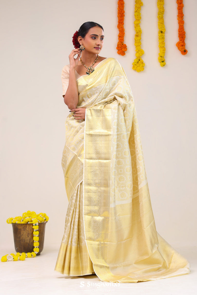 Delicate and precious, this Hansa Yellow Tissue Kanjivaram Saree features multi-geometerical pattern jaal weaving in gold zari. The contrasting gold big border with floral and diamond pattern elevates the look. Drape it for festive and wedding occasions.