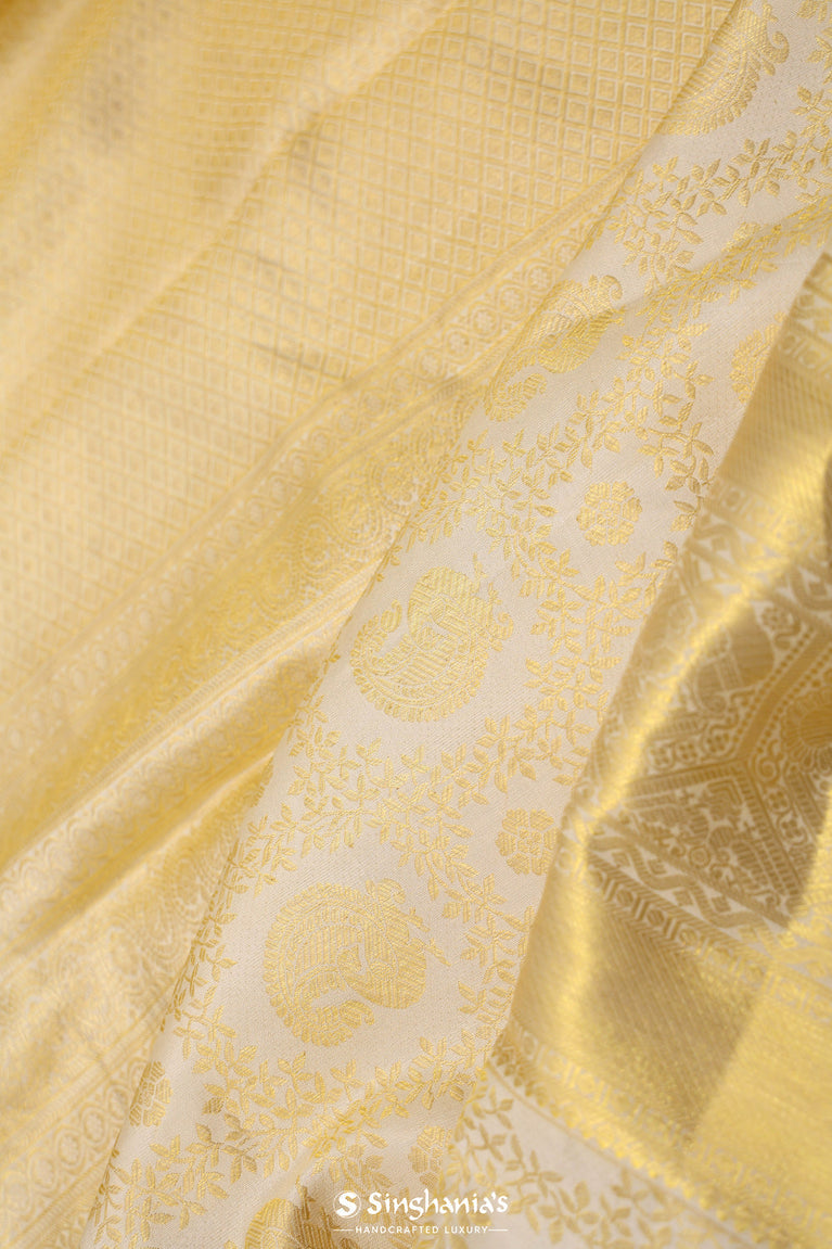 A simple ivory white kanjivaram silk saree showcasing heritage peacock and floral vine motifs in fine gold zari. The big border features traditional vannams (patterns), while the pallu displays an elaborate arrangement of floral spires. A perfect choice for wedding receptions and formal occasions.