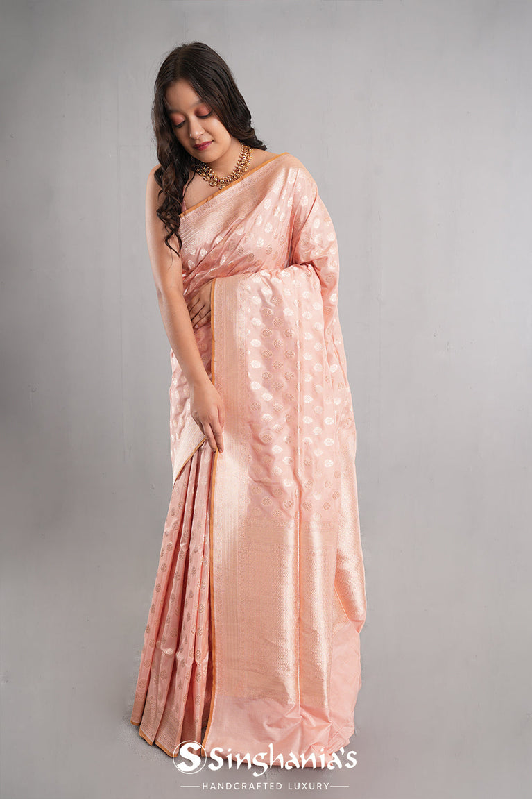 Delicate heather peach banarasi saree is crafted from silk fabric, featuring floral butti patterns with gold accents across the body and small border and pallu with floral-geometric design & self edging. Perfect for festive and wedding occasions.