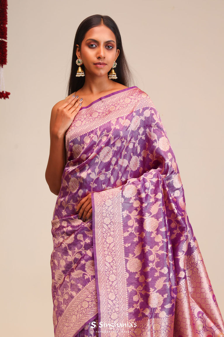 This is a traditional purple tissue banarasi saree for festive, wedding occasions and party wear. Adorned with gold zari floral butta jaal weaving all over the body and a small, floral creeper border and pallu, completing the whole look.