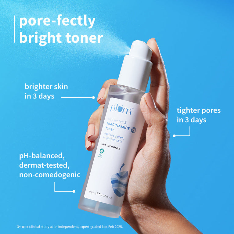 3% niacinamide toner with rice water, 150ml: * clinically proven to brighten skin & tighten pores in 3 days * non-comedogenic, dermat-tested * alcohol-free toner