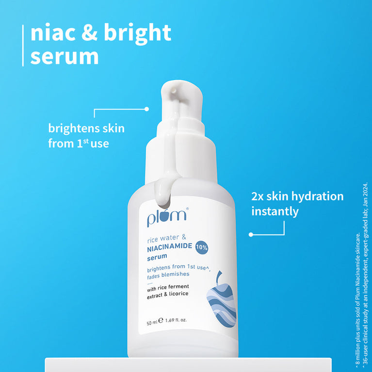 10% niacinamide face serum with rice water, 50ml: * clinically proven to brighten skin from 1st use * fades blemishes for clear skin * smoothens skin texture * dermat-tested